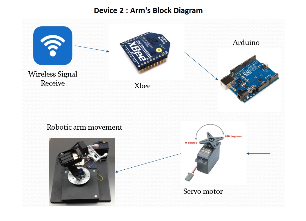 The below figure illustrates the robotic arm’s block diagram. After the information has been received by the device 2 with the use of the Xbee module attached to the second Arduino, the controller translates it into a movement for the appropriate servo motor, according to the finger move. The result is the movement of the robotic arm.
